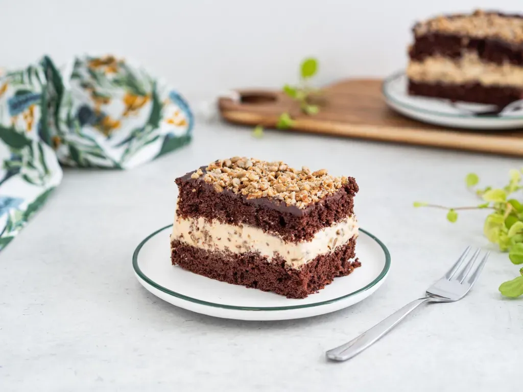 Najistotniejsze informacje:- Ciasto słonecznikowiec składa się z biszkoptu czekoladowego, karmelizowanego słonecznika i kremu kajmakowego.